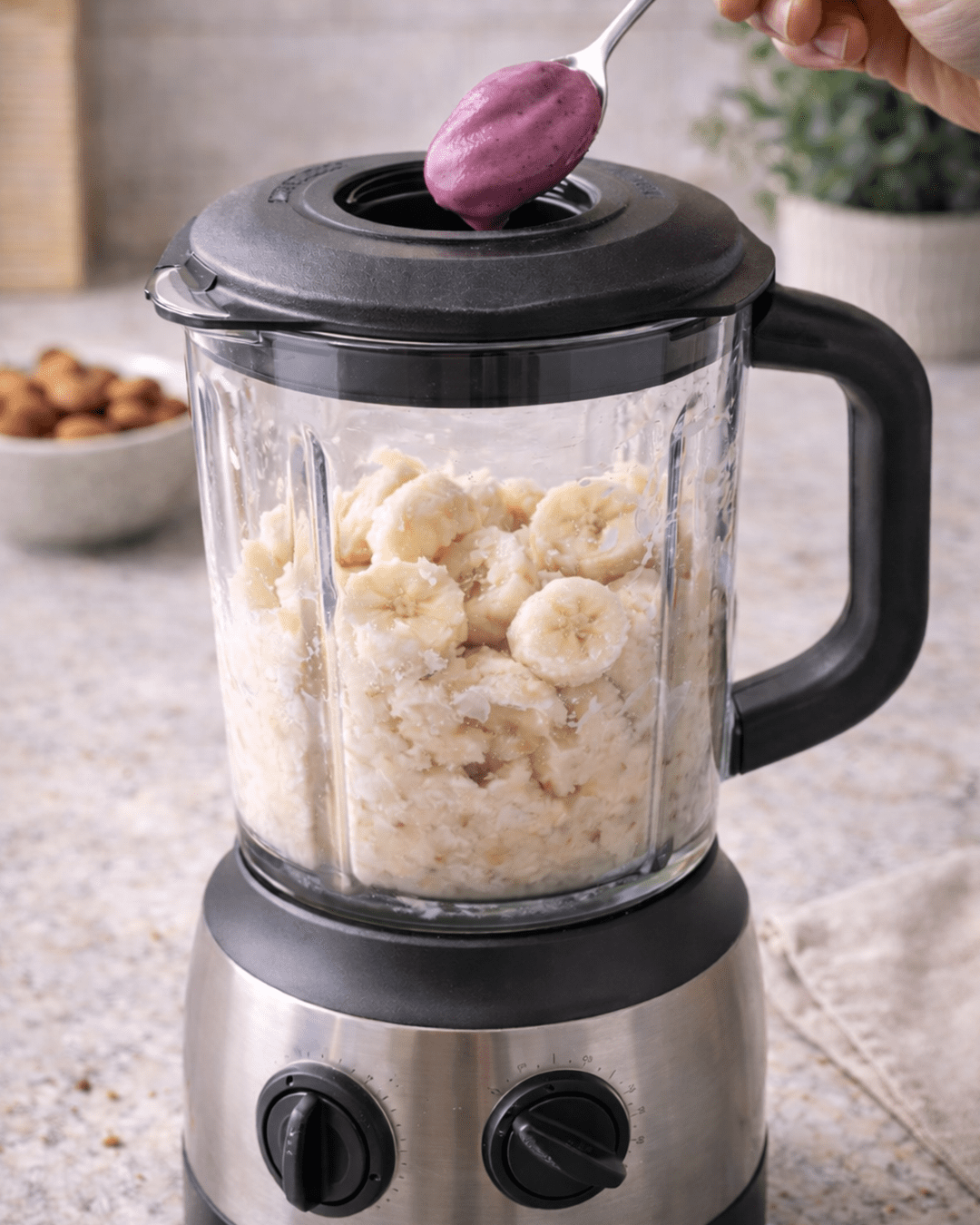 - Coloca las bananas congeladas en la licuadora, agrega un poco de leche para facilitar la trituración.