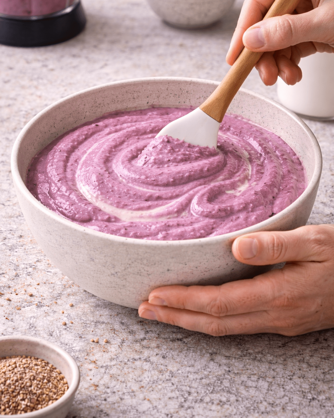 - Agrega poco a poco la leche vegetal y mezcla despacio hasta lograr una textura cremosa.